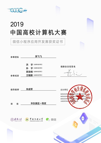 8月15日,2019中国高校计算机大赛——微信小程序应用开发赛在广州华南理工大学(大学城校区)落下帷幕,软件工程学院、网络安全学生在大赛中荣获华东赛区一等奖。