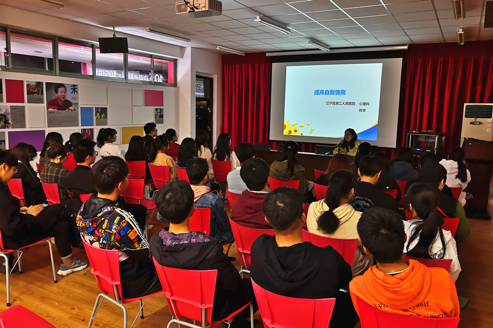 首先,由江宁区第二人民医院心理科肖华主任为同学们作了主题为“提高自我情商”的心理专题报告。肖主任表示,大学生要善于发现自己的情绪,及时觉察身体的变化,找出诱发情绪的外在原因,做好自我调节,以提高个人情商,增强人际关系中的积极效能,与周围同学和睦快乐相处中营造自我的健康心态。