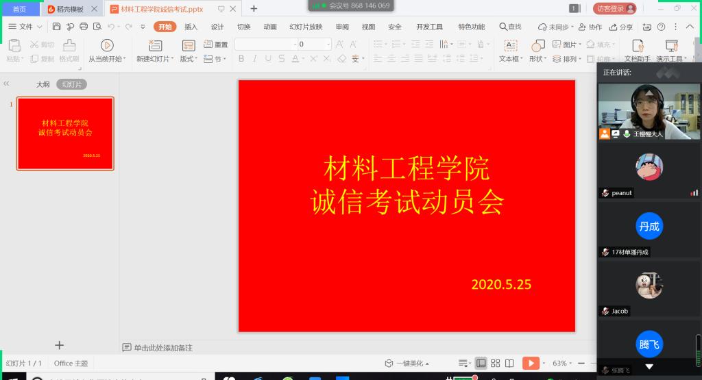 为了响应践行社会主义核心价值观活动的号召,加强我院学风建设,严肃考风考纪,5月25日下午16:15,材料工程学院召开线上诚信考试动员会。材料工程学院辅导员王亚男主持本次会议,各班班长和学生代表参加。