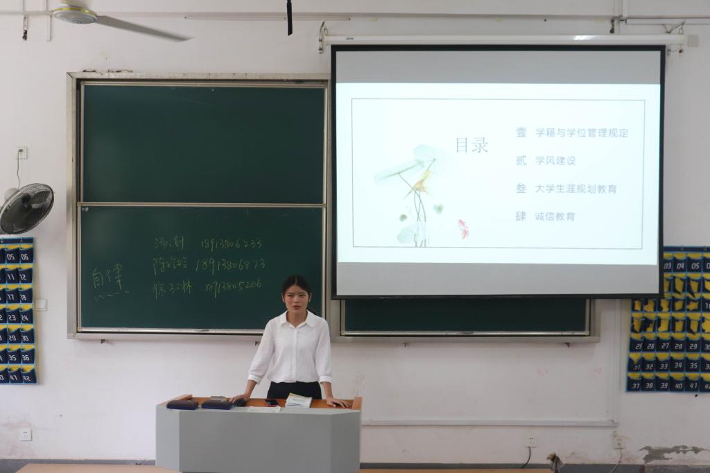 会议伊始,陈玲玲老师从旅游管理专业的学科建设情况、师资力量、前景优势等方面为新生们进行了详细介绍,她希望同学们提早确立学习目标,不断提高自身职业能力,合理规划,为自己赢得更多发展机会。随后,童明明、杨一鸣、马思齐、汪新、梅冬琴几位老师,分别从党建教育、团学与社会实践能力教育、心理健康及资助政策教育、宿舍管理、学风与纪律教育五个方面向新生一一介绍,老师们借助多媒体技术,以PPT和视频播放的方式讲述,内容丰富多彩,形式生动有趣,使新生对校园生活有了较为直观的认识。童明明老师对新生寄予厚望,希望他们能够破旧舟、竞千帆,仰望星空的同时也不忘脚踏实地,沉潜学习,不辜负大学美好时光。
