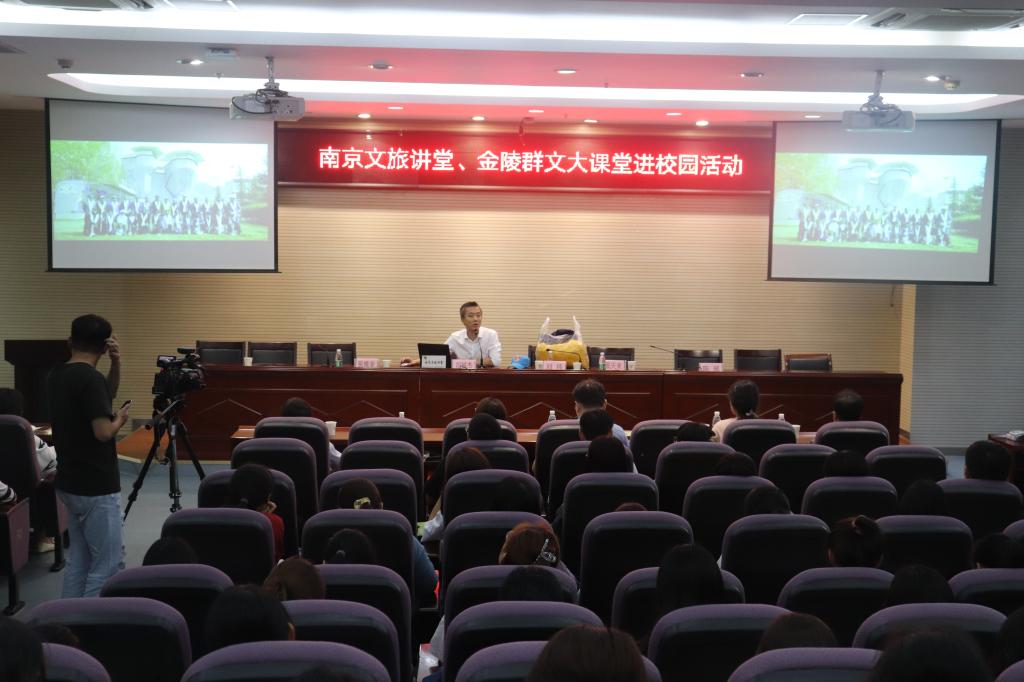 9月16日下午3:00,在幕府校区图书馆报告厅,人文学院举办了南京文旅讲堂、金陵群文大课堂进校园活动。南京市文旅局科技教育处刘伟处长、陈瑶主任、“蓝天之笑”公益组织创始人胡铖杰、人文学院院长张维亚、党委副书记周建峰出席了本次讲座,我院150余名学生参与本次活动。