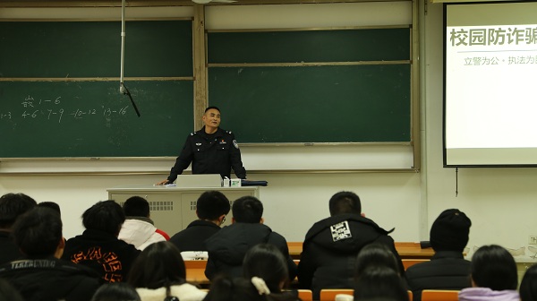 活动伊始,陈康乐警官以立警为公、执法为民进行讲解;他结合实际案例对校园常见诈骗类型作出了具体案例分析,并列举13条常见诈骗手段和4条防诈骗提醒。讲座的最后,陈警官提出了防欺诈的“四不两学会”:不轻信陌生人;不轻易借手机;不凑网络小便宜;不随意透漏隐私;学会拒绝;学会正确拨打110并准确告知信息。陈警官希望通过这些生活中的实际案例,帮助同学们增强风险防范意识。