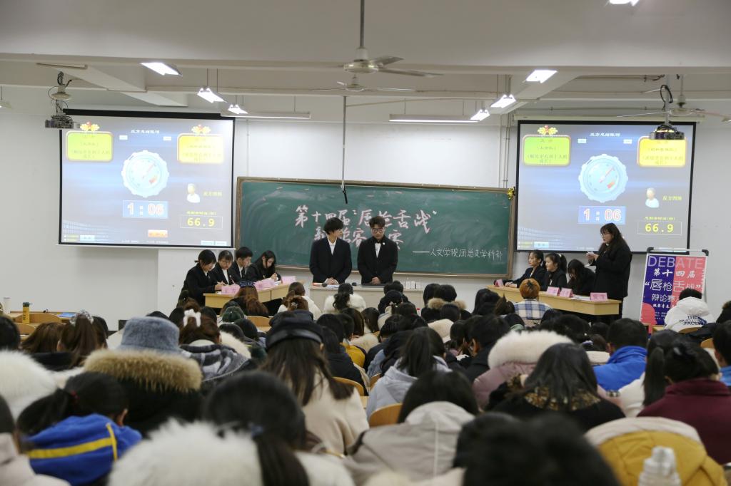 为培养学生的思辨和表达能力,12月18日晚6:30,人文学院在图教楼b205举办了第十四届唇枪舌战辩论赛决赛。辅导员梅冬琴老师、人文学院团总支学生会执行主席余茜、历届优秀辩手担任本次比赛的评委。