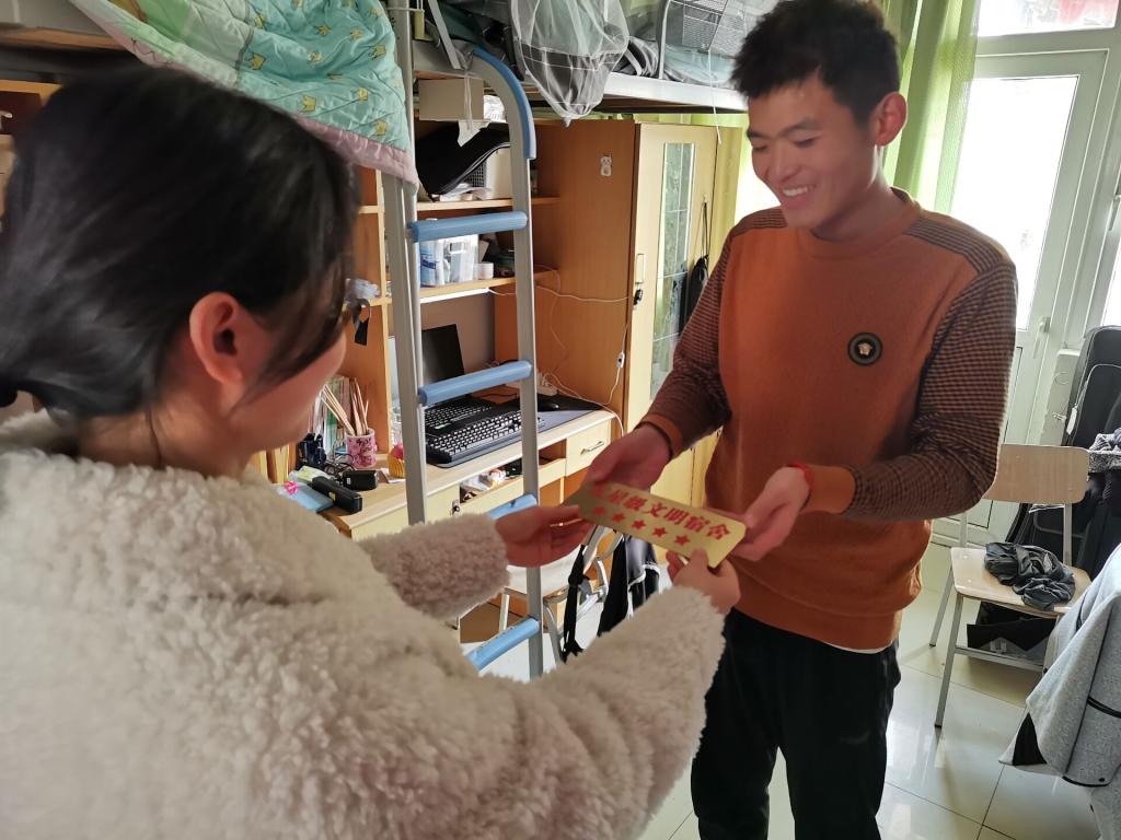 在本学期星级文明宿舍评选活动中,学院积极组织优秀宿舍进行申报,共推荐164个宿舍参加评选。经学校评定,学院共有54个宿舍成功入选,其中,五星级宿舍41个,四星级宿舍13个。挂牌活动中,老师与同学们亲切交谈,了解同学们的思想状况和学习生活情况,并对星级宿舍提出要求,希望同学们继续保持,发挥好带头作用。