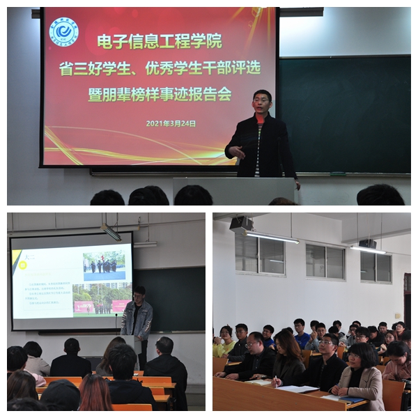 3月24日,电子信息工程学院在江宁校区1311教室举办省级三好学生、优秀学生干部推荐选拔暨朋辈榜样事迹报告会。学院党委副书记吴有龙,辅导员邹文荣、叶晴、李岩、梁咪咪,六名参与评选的学生,19、20级60余名学生参加了报告会。