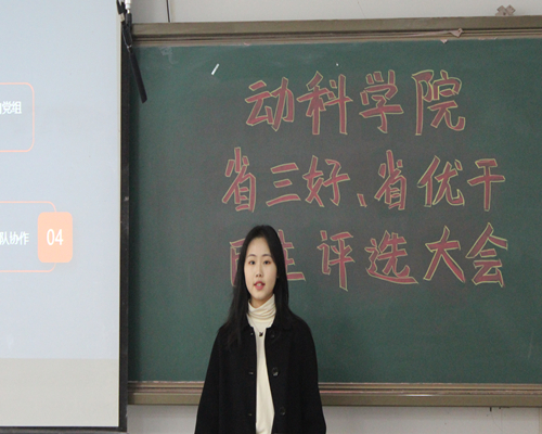 3月24日,动物科学与技术学院在图教楼B102召开省级三好学生、优秀学生干部评选会。经过个人申报、学院审核,共有六名同学参加了此次公开竞选,动科学院党委副书记黄淑婧、各年级辅导员、班主任代表以及各班班干代表、学生会主席团成员组成评审代表参与此次评选会。