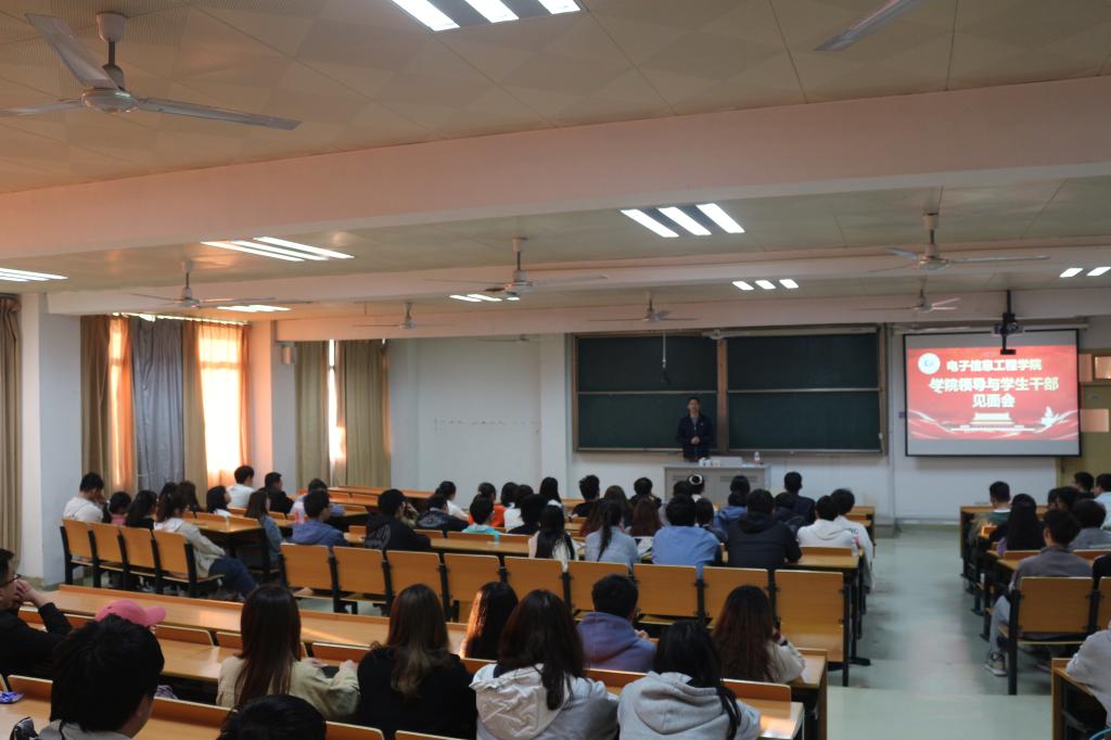 4月9日,电子信息工程学院在1332教室进行了学院领导与学生干部见面会,参与本次活动的有学院党委副书记吴有龙、辅导员叶晴、第八届团总支学生会全体成员和各年级主要学生干部。