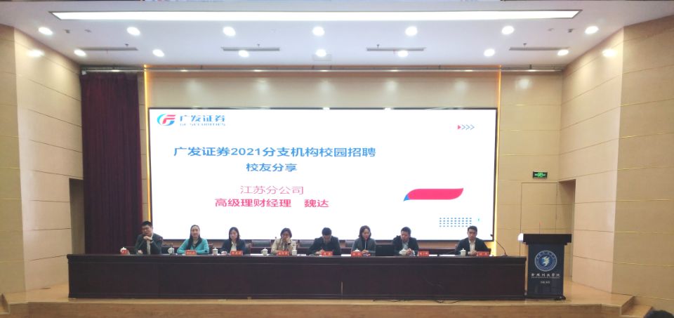 ;4月12日下午1点,商学院在科技楼1号楼报告厅召开广发证券、泰康养老宣讲会,广发证券江苏分公司营销总监陈红雨、运营管理部总经理陈娟,泰康养老二大区总监孟凡、组织发展部总经理蔡小峰、组织发展部凌娣,商学院党委书记周骏、院长顾晓燕、副书记孙亮、副院长史新和、辅导员和班主任老师及2021届和2022届相关专业学生等一百余人参加了会议。