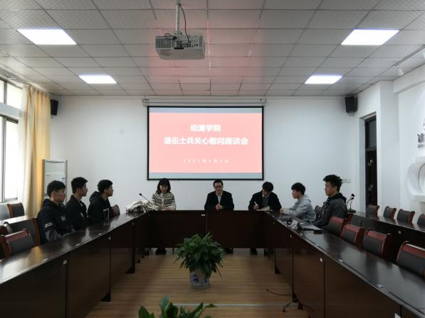 4月19日,动漫学院7号教学楼7406会议室召开2021年退伍复学学生座谈会。学院党总支部副书记、副院长匡才远,学工办副主任、辅导员聂钰石,征兵工作负责人、辅导员参加此次座谈。