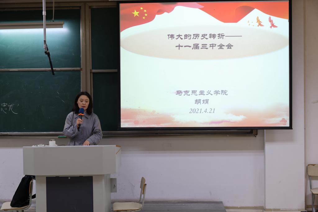 为迎接中国共产党成立100周年,在青年学生中深入开展党史学习教育,国际教育学院邀请马克思主义学院的胡娟老师于4月21日下午,在江宁校区2302、2402教室为同学们开展主题为“伟大的历史转折——十一届三中全会”的党史宣讲专题形式与政策讲座。