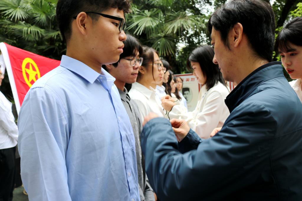 仪式在庄严的国歌声中拉开序幕。本学期,按照团员发展工作流程,经校团委批准了人文学院10位同学加入中国共青团。伴着嘹亮的团歌,到场老师们作为老团员代表,一一为新团员们佩戴团徽,面对鲜红团旗,全体新团员右手握拳,手举过肩,以最宏亮的声音进行了庄严宣誓。仪式上,优秀团员代表来自金陵剧社的同学们,朗诵了诗歌《信念永恒》,带领大家走进了党的“第一百个绚烂的春季”,使现场同学接受了一次心灵的洗礼。活动最后,李海菁老师向新团员们提出了希望:同学们要在建党百年之际,学习革命先烈为国捐躯的英勇精神,做一个顶天立地的新时代青年。在五位优秀团员带领下,全场合唱《光荣啊,中国共青团》,将全场气氛推至高潮。