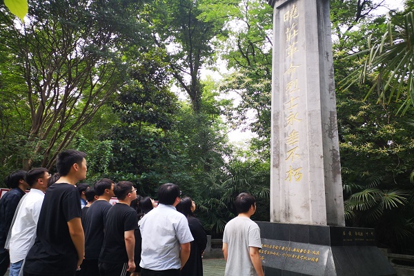 炎炎烈日下,同学们整齐有序地走到陶行知纪念馆,了解陶行知先生的生平事迹。随后,同学们走到晓庄十英烈碑前,庄重且严肃地对烈士们进行祭拜。最后,同学们到达陶行知先生的墓碑前进行合影留念。在离开纪念馆时,同学们都感叹陶行知先生的三大教育思想——“生活即教育”“社会即学校”“教学做合一”,并表示今后要好好传承陶行知先生的思想,不止现在,也包括未来。