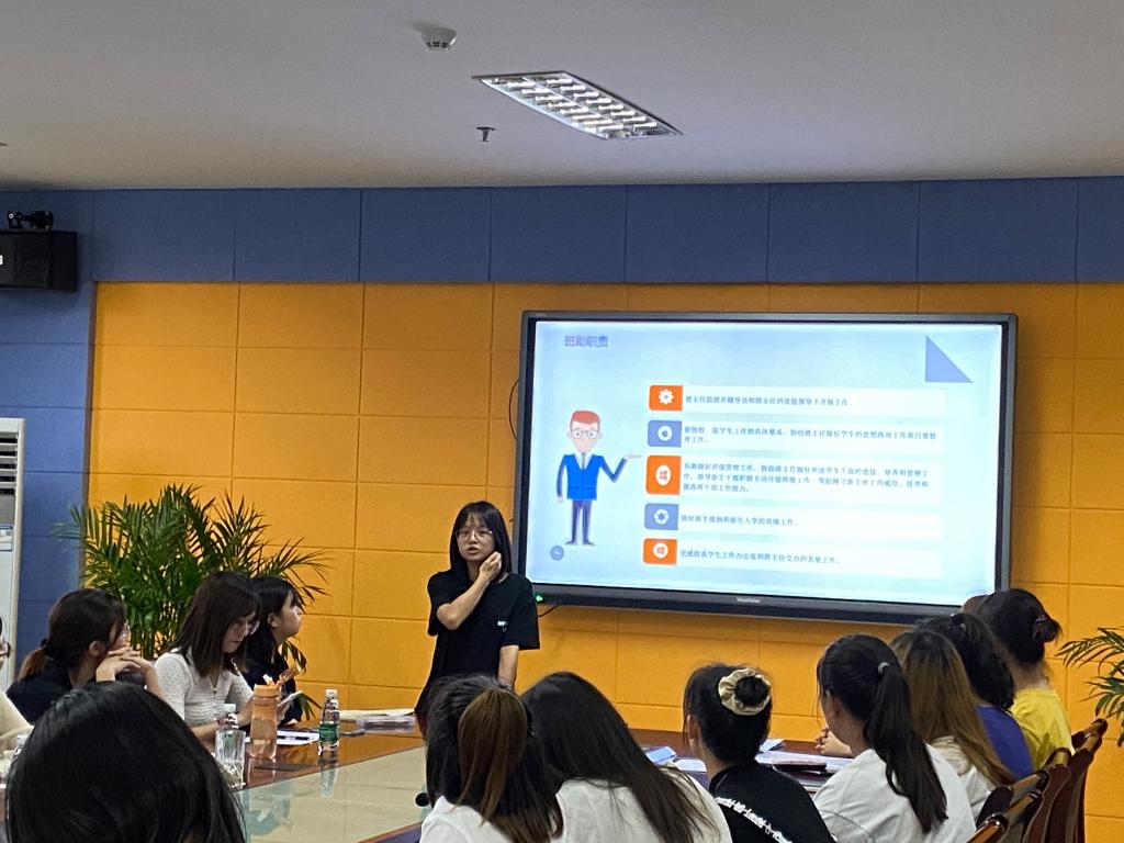 会上,新生班辅导员助理们依次上台进行述职报告,他们结合自己所带班级特点和自身工作经历,介绍了迎新报到、军训期间陪同、协助班主任组织开展班级集体活动、建设班级学风考风等工作的具体落实情况,分享个人在任务安排和分配中遇到的困难和解决的方法、措施,以及对一年来工作存在的不足之处的深刻反思。辅导员助理们通过精美的PPT、真情实感的演讲赢得了在场所有人的阵阵掌声。虽然每人只有短短2分钟述职时间,但他们溢于言表的情感让我们感受到他们一年来工作的收获,更展现出了商科学子认真负责的工作态度和积极向上的精神面貌。最后,辅导员老师们给新生班辅导员助理评分,并结合所带班级表现、学生民主测评、个人述职等因素进行综合考核。