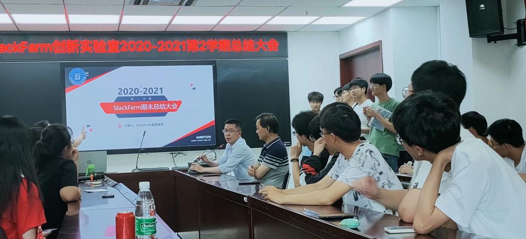 本次总结大会主要分为五项议程,第一项议程:实验室各年级成员分别汇报了本学期各自的学习成果,总结了本学年的收获。并罗列出自己的暑期学习计划。第二项议程是欢迎20级新进成员,新成员的自我介绍向学院展现出StackFarm创新实验室生生不息的活力与满怀朝气的创造力。第三项议程:为表示对StackFarm创新实验室这一学年成果的肯定,徐书记和吴老师给予了StackFarm创新实验室鼓励与赞扬,同时也提出更高的期望与要求,希望StackFarm创新实验室在接下来的发展中,再创辉煌,更进一步。