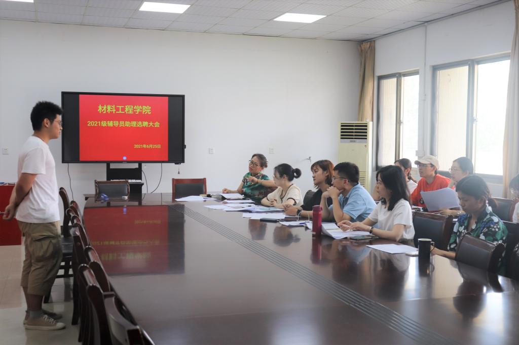 为顺利选拔2021级新生班辅导员助理,并对参选同学进行思想审核,考察竞选者的语言组织、临场发挥、情况处置能力,材料工程学院于6月25日中午在学院会议室举办2021级新生班辅导员助理选拔。材料工程学院党委副书记陈智慧、全体辅导员、18级辅导员助理担任评委,竞选候选人参加。
