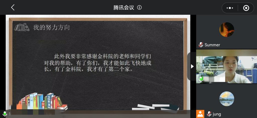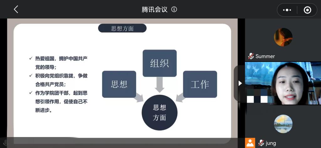 “青年躬行路,奋进新时代。”秉持公开、公平、公正的原则,十八位候选人借助PPT与视频通话的形式,依次介绍了在学习成绩、思想政治、职业技能、公益实践、荣誉奖项等成就与收获。答辩会如同一场经验成果交流会,虽短短三分钟,彰显了候选同学“冰冻三尺非一日之寒”的学习功力和“绝知此事要躬行”的实践能力。大家来自不同年级不同专业,却共同体现着勤奋好学、精益求精、勇于实践的优秀品质,展现了人文学子积极向上的精神风貌。