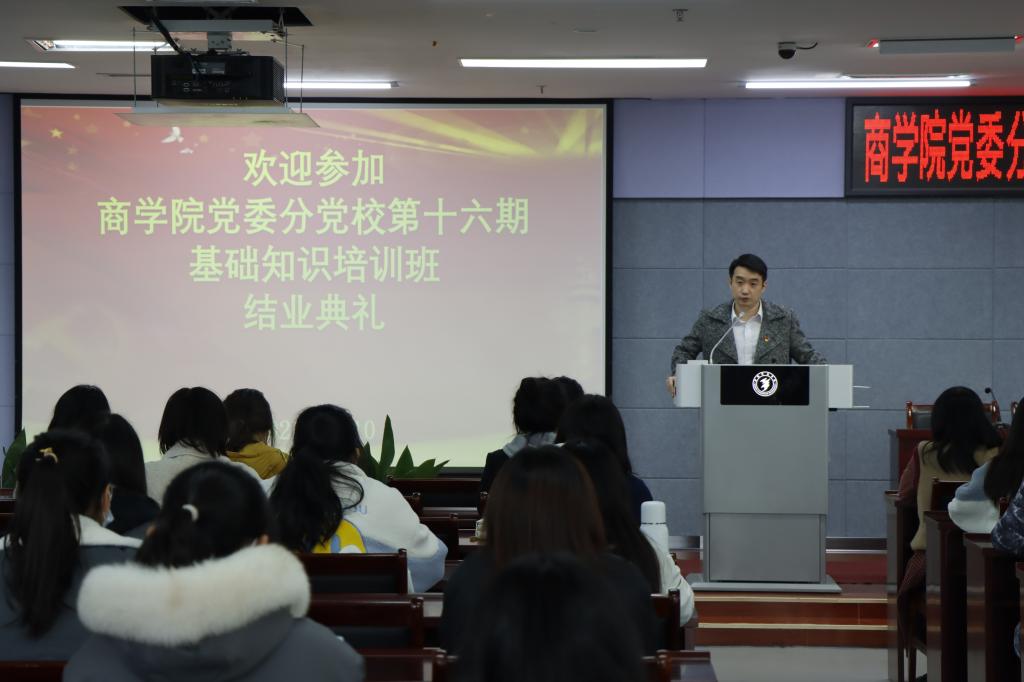 12月10日,商学院党委分党校在科技楼三号楼313召开结业典礼,商学院党委副书记孙亮,商学院党委学生党支部书记潘阳、沈皆希、李竹叶、黄丹丽,以及70名学员代表参加。会上,黄丹丽老师对本期培训班总体情况进行了析总结,并宣读优秀学员表彰决定,与会领导、老师为优秀学员颁发证书。优秀学员代表20国际经济与贸易(2)班陈丹睿同学和21会计学(1)班黄烨同学分别发言,表明今后将更加严格要求自己,积极接受党组织考验,争取早日加入中国共产党,并对党组织和授课老师表示感谢。受学院党委和分党校委托,孙亮副书记对培训班的成功举办和结业学员顺利完成学习实践任务表示祝贺,并对学员们提出以下三点要求:一是要树立远大目标,珍惜时光,脚踏实地,从点滴做起;二是要以党员的标准要求自己,力争全面发展;三是发挥模范带头作用,从自己做起,带动周围同学,为营造良好学风增砖添瓦。(撰稿:黄丹丽,审稿:孙亮)