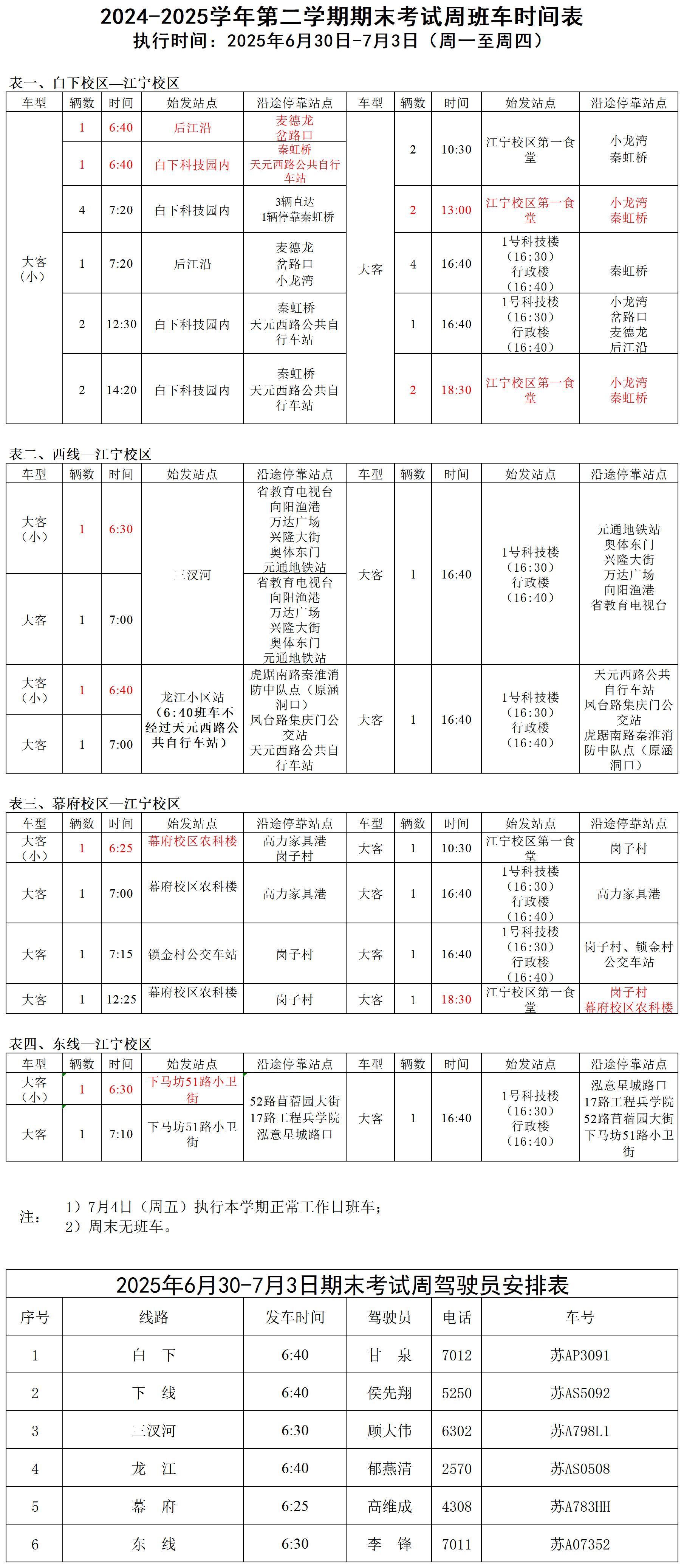 1.该班车安排执行时间为2025年6月30日-7月3日(周一至周四),7月4日(周五)执行本学期正常工作日班车,周末无班车安排。