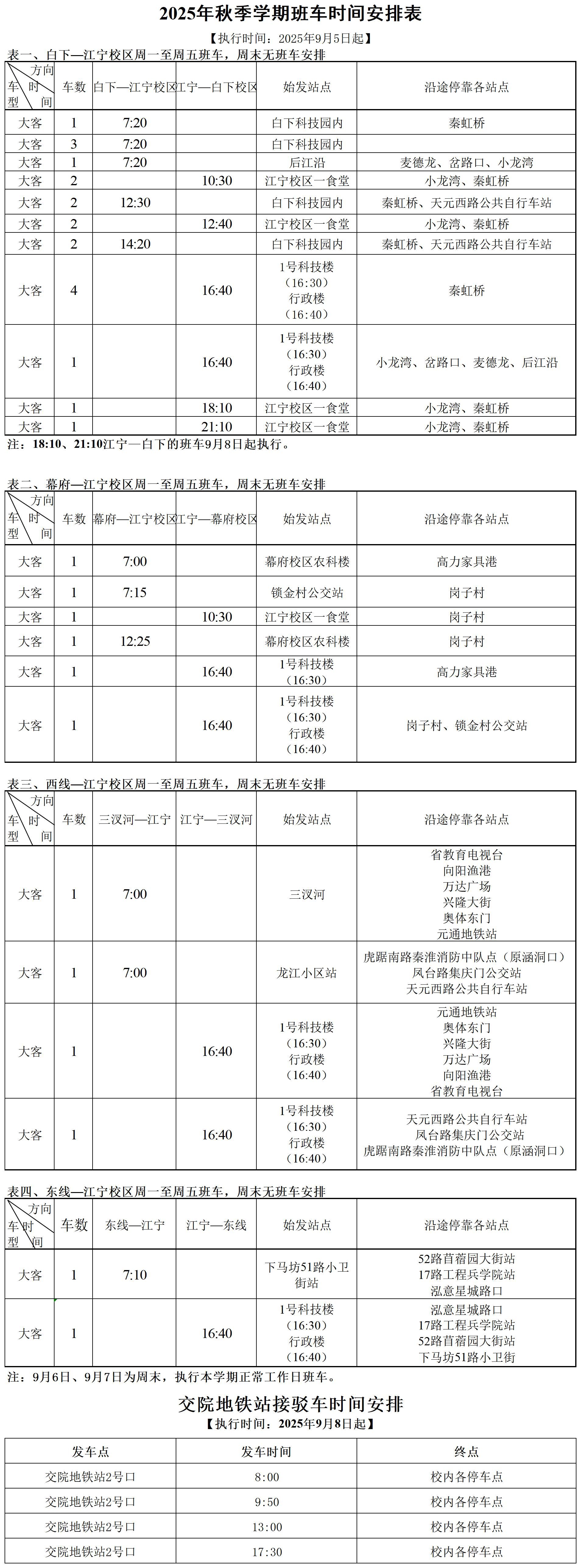 2.江宁校区至地铁站接驳班车及18:10、21:10江宁校区至白下校区班车自9月8日开始执行;